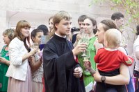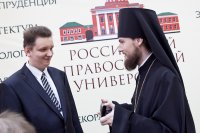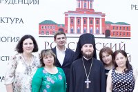 В этот торжественный день ректор Российского православного университета игумен Петр (Еремеев) отслужил благодарственный молебен в домовом храме университета - церкви Иоанна Богослова под Вязом.