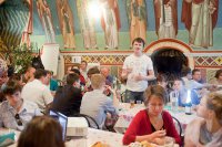 Для них была подготовлена не только дружеская трапеза, в ходе которой выпускники смогли в неформальной обстановке поделиться своими воспоминаниями и обсудить перспективы, но также была организована и обзорная экскурсия по монастырю, которую для них провел замдекана факультета Церковного служения РПУ иеродиакон Лаврентий (Полешкевич).