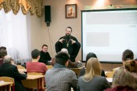 Проект студентам и преподавателям университета представили протоиерей Павел Великанов, доцент Московской духовной академии, главный редактор портала Богослов.Ru, и руководитель проекта диакон Анатолий Колот. Они рассказали о том, с какими целями задумывался "Разговор на ты", по какому принципу подбирались темы для бесед. Как отметил отец Павел, участники проекта стремились затронуть ряд острых социальных вопросов, волнующих как светских, так и церковных современников.