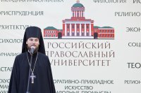 В этот торжественный день ректор Российского православного университета игумен Петр (Еремеев) отслужил благодарственный молебен в домовом храме университета - церкви Иоанна Богослова под Вязом.