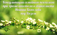 Семейный психолог, кандидат психологических наук, профессор кафедры психологии православного института св.ап.Иоанна Богослова Тамара Ивановна Дымнова проводит благотворительные консультации за пожертвования на формирование приходской библиотеки храма святого апостола и евангелиста Иоанна Богослова под Вязом.